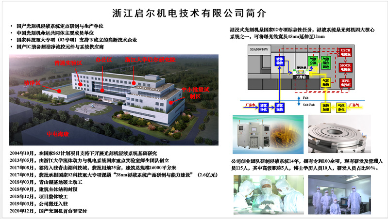 浙江启尔机电技术有限公司主要从事微电子制造装备。公司前身为浙江大学流体动力与机电系统国家重点实验室的科研团队,该团队自2004年以来,在国家863计划和国家重大专项等科研项目支持下,对“光刻机浸液系统”开展了十余年的技术攻关和产品研发,拥有国内领域最强技术积累和100余项发明专利。公司主要产品光刻机浸液系统是浸没式光刻机的四大核心部件之一,得到国家02重大科技专项支持。2013年团队转型为公司化运行,使研发和管理体系得到不断完善。公司在青山湖科技城建设光刻机浸液系统产品研制与小批量生产基地。未来,公司将继续依托浙江大学流体动力与机电系统国家重点实验室等国家级研究平台,专注于光刻机浸液系统及其超洁净流控元件的研发和生产,矢志成为我国半导体装备产业的核心企业。